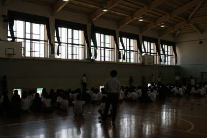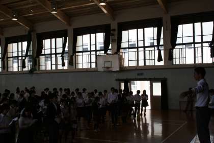 今日の6時間目、3年生は修学旅行の隊形練習のための学年集会がありました。