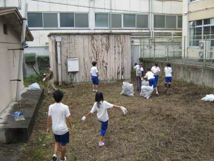 内容は武道場裏の草刈りとその周辺の掃き掃除。