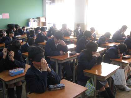 今月は「人権月間」です。衣中では、各学年ごとにテーマをもうけて学習します。1年生は障害者問題をとりあげ視覚障害について学習します。今日は人権学活の1時間目でした。クラスで、全員がアイマスクを着用し目が見えない状態を体験したり、明後日講演をされる講師の方が出演されているDVDを鑑賞しました。