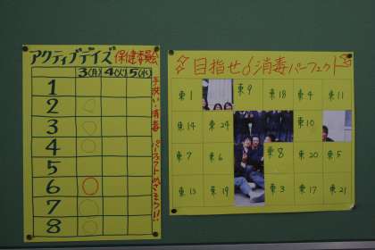 朝のあいさつ運動から始まり、昼休みは保健委員による消毒がありました。