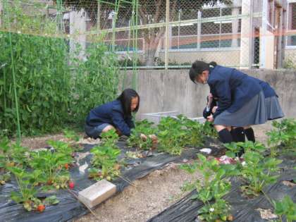衣笠中学校でイチゴを栽培しております。今日、そのイチゴを収穫しました。美化委員の生徒が中心となって頑張ってくれました。赤くておいしいイチゴです。