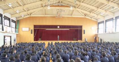 2月2日(火)1限の全校集会の様子です。最初に北警察署の方が来校され,自転車の乗り方やマナーなど,交通安全について話しをしていただきました。自転車は車との事故などで被害者の立場に立つことが多いように思われがちですが,近年は対歩行者に対して加害者となるケースも増えています。自らの命を守るためには交通ルールやマナーを守ることが大切ですが,そのことが実は他の人の命を守ることにもなるのです。今日の話を心に留め,普段の生活の中で是非生かせるように努力して欲しいと思います。