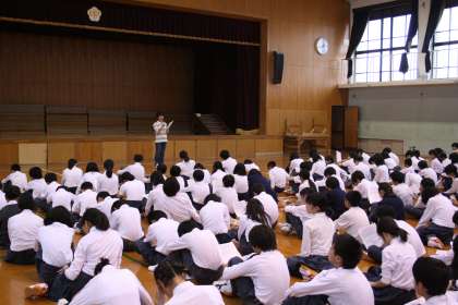 1年生は体育館にて学年集会形式でこれから始まる総合的な学習の一環である