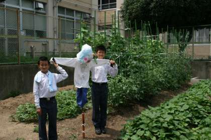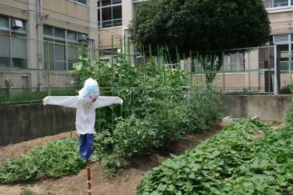 菜園のカラスなどの対策として、1年5組の生徒の発案で案山子を作ってくれました。これで一定の効果があることを期待します。あとは獣対策が必要です。先日のトウモロコシ畑荒らしをネットなどで調べるとタヌキか、アライグマなどが荒らした可能性があるようです。これから人間と獣との知恵比べです。