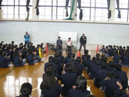 本日の5,6時間目に1年生は人権学習を行いました。「車いす体験や車いすバスケット選手からの講演を聴き、社会で共に生きていくためにできることを知る」という学習をしました。車いすバスケットの選手には「京都アップス」というチームから山本さんと野村さん、京都市教育委員会体育健康教室からは坂野先生に来校していただき、車いすバスケットのお話や車いす生活にいたるまでのお話などをしていただきました。1年生全員が車いす体験をしたり、また、希望者には車いすバスケットの体験もさせていただきました。大変良い体験ができました。