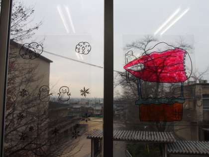 美化・保健委員がゴミ拾いと換気の呼びかけを行ってくれました。その取り組みの一つで、窓に2枚の絵が貼ってあり、窓を開けると2枚の絵が重なり、新しい絵が登場します。寒くても窓を開けるのが楽しみになります。上の写真は、窓が閉まっている状態で、下の写真が、開いている状態です。