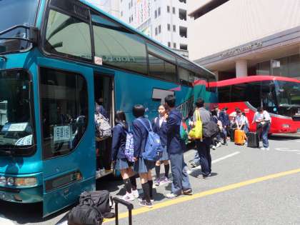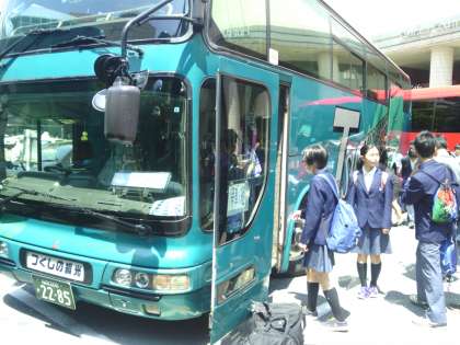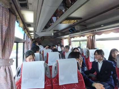 博多からバスに乗り込んで牧島に向かいます。バスの中ではレクリエーションで大盛り上がり!