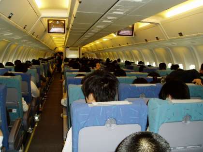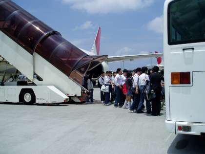 機内の様子と那覇空港到着直後の3年生です。