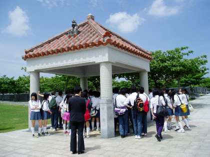 平和祈念資料館でガイドさんの説明を聞いています。