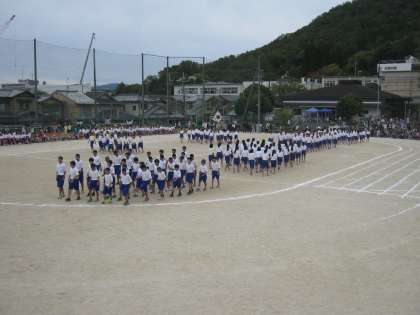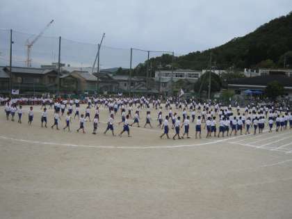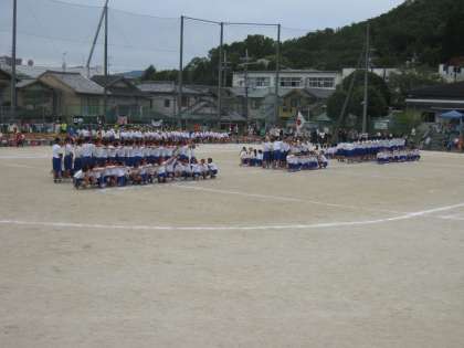 さてお待ちかね、各学年の団体演技です。マスゲーム調あり、はっぴあり、ダンスあり。今年度の目玉です。まずは1年生。
