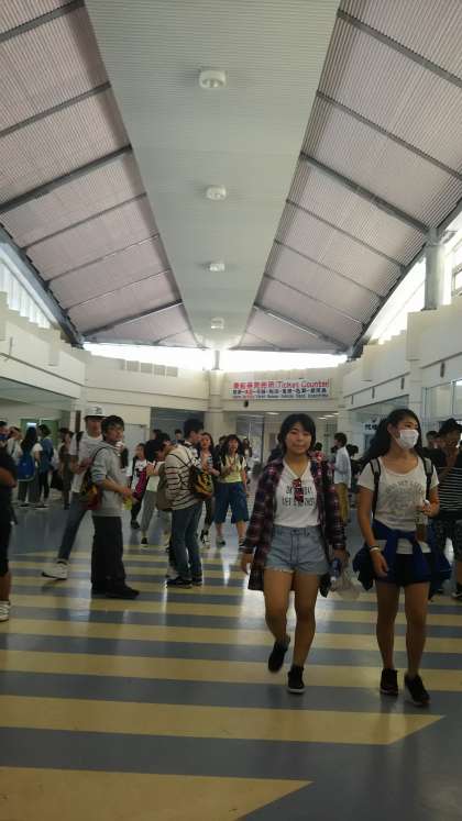 本部港に着きました。思ったより大きなフェリーなんですね。30分の船旅です。もうすぐ伊江島です。ところで、”いえじま””いえしま”どちらが正しいのでしょうか?