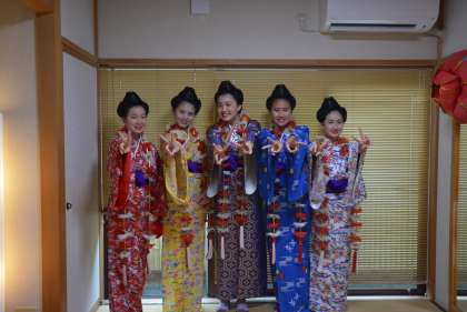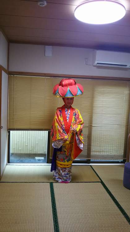 琉球民族衣装(琉装:りゅうそう)の着付けをしました。お澄ましイナグ(女の子)とイェーイイナグ。花笠がかわいいですね。