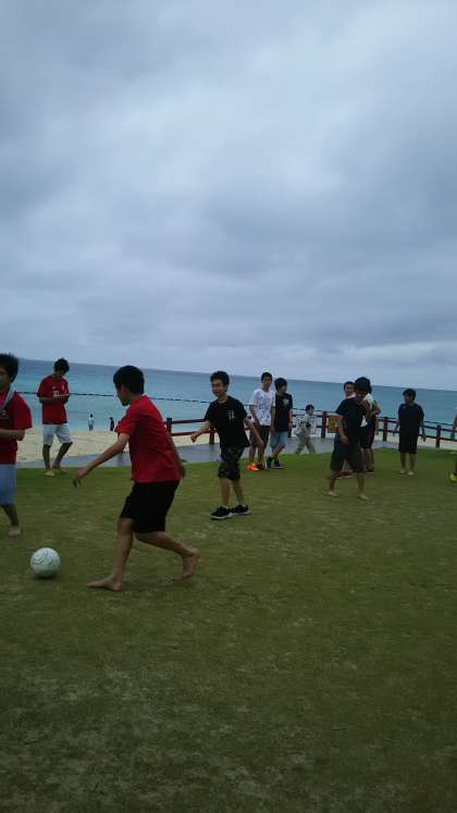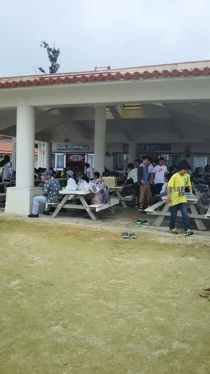 伊江島ビーチです。学年レクリエーションのため生徒がどんどん集まってきます。雨大丈夫なのかな?
