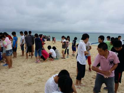 伊江ビーチ続きです。ところでみんなにをして楽しんでいるのでしょうか?バレー(これは確実)と話し合い(?)と…すもう。