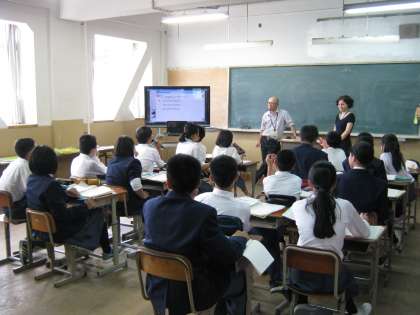 今日の6時間目、校下の小学校旧6年生担任の先生方が参観に見えられました。ほんの2か月しかたっていないのですが、懐かしいやら恥ずかしいやらで一時は騒然としたようですが、すぐにいつもの授業のペースに戻りました。でもみんな大張り切りで授業を受けていたようですよ。小学校の先生方も、立派になった姿を見てニコニコされていました。