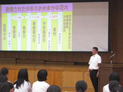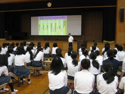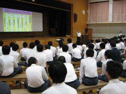 本日6時間目、1年生は「非行防止教室」でした。京都府警から教育委員会に派遣されておられる晝川担当課長に講演をしていただきました。身近な問題行動から薬物に至るまで、たくさんお話をしていただきました。最後の質疑応答では、途切れることなくたくさんの質問が出ていました。今日の講演を聞いて、きちんとルールを守る大切さと薬物には絶対手を出さないということを心に誓いました。
