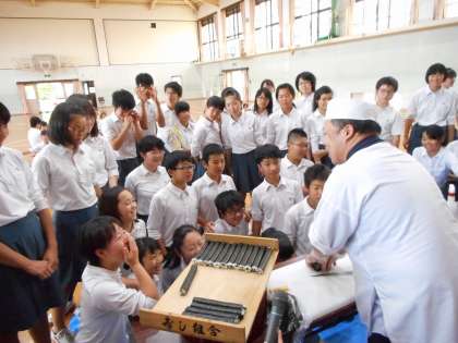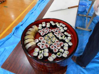 老舗のお寿司屋さんが、目の前で巻いてくれた巻き寿司の出来上がりの綺麗さにみんな驚いていました。