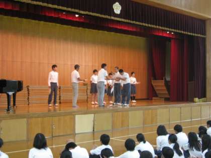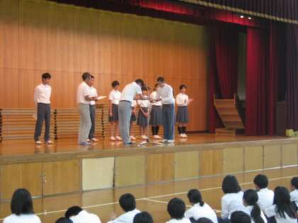 本日5時間目に全校集会があり、水泳部の男子50m自由形第3位の表彰と夏季水泳競技(水球の部)のB区分第4位の表彰、秋季大会女子200mリレー第3位の表彰、美術部への校門壁画の感謝状、卓球部の近畿大会表彰と夏季全国大会出場の報告と、たくさんの活躍に対する表彰がありました。すでに秋季新人大会もはじまっています。これからもみんなの活躍を楽しみにしていますよ!がんばれ衣中生!