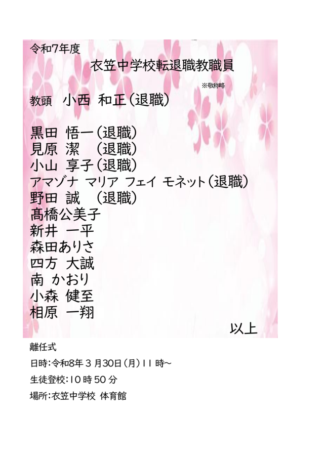 離任式は、以下の日程で実施予定です。