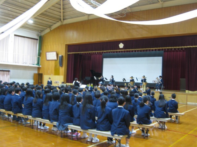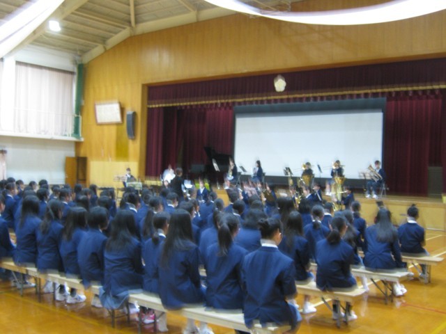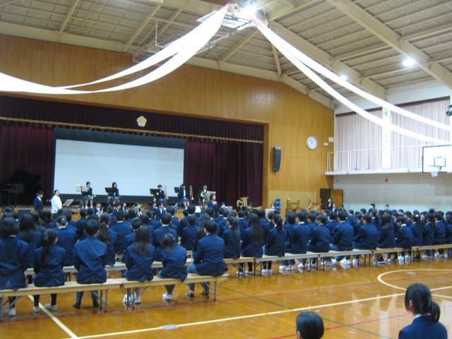 吹奏楽部の演奏にのせて新1年生が入場し、会場は温かな拍手に包まれました。生徒会長による開会宣言のあと、吹奏楽部の演奏、生徒会オリエンテーションが行われました。