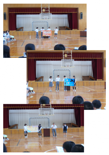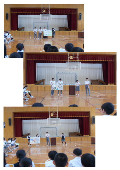 6月15日(木)5,6限 体育館で生徒総会が開かれました。生徒会長の挨拶で始まり、生徒会目標や活動方針、委員会の活動内容や学級の意見に対する応答などが行われました。後半は各クラスの生徒議員による学級目標の紹介と説明がありました。発表する側も聞く側もしっかりと取り組めていました。先輩たちの発表に、1年生は目を輝かせて聞き入っていました。