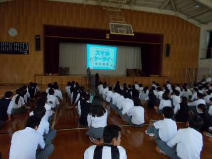 携帯電話教室 公開日 2017/06/22 更新日 2017/06/22 学校の様子 6月22日(木) 6限 体育館にて携帯電話教室が行われました。携帯電話の安心・安全な使い方、使う上でのルールやマナーの向上をはかることや個人情報漏洩などのネット問題の怖さを認識することを目的に行いました。NTTドコモの方や人権擁護委員の方が映像を使ってわかりやすく説明して下さいました。烏丸中の生徒の聞く態度がとてもよかったとほめて帰られました。