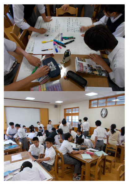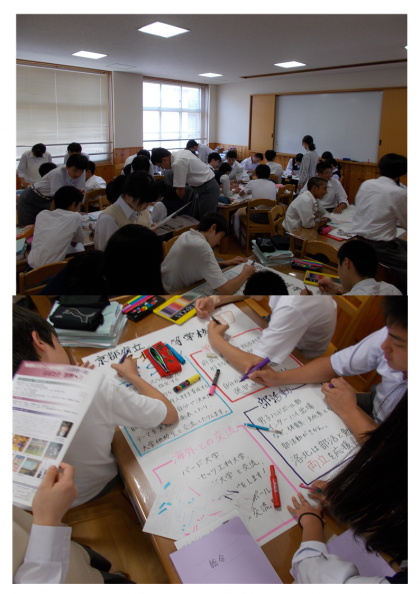 6月23日(金)6限 3年生は、総合的な学習の時間に、先日行った高校訪問学習の内容を模造紙にまとめる活動を行いました。男女仲良く仕事を分担し、どの班もすばらしいのもが完成しました。