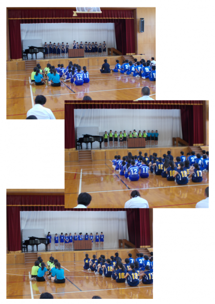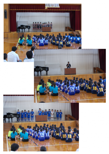 夏季大会激励会 公開日 2017/07/07 更新日 2017/07/07 学校の様子 7月6日(木) 6限 夏季大会に向けての激励会が行われました。各部活動キャプテンによる決意表明、生徒代表による激励の言葉、学校長からの激励の言葉、選手宣誓など盛りだくさんな内容でした。最後に全校生徒で円陣を組んで烏丸中学校の団結を高めることができました。夏季大会に出場する皆さん全力で頑張って下さい、応援しています。