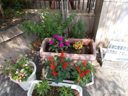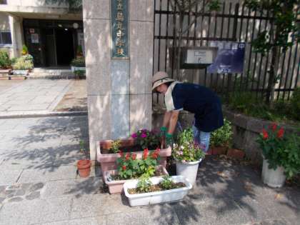 梅雨に入って雨が降らなかったり、時には激しく降ったりと自然は身勝手な行動を取ります。そんな中、いつも烏丸中学校の花々を気にかけて下さっている方がおられます。雨の日も風の強い日も、来校し世話をして下さいます。そろそろ花の植え替えを行うこの時期、花壇やプランターに新しい苗を植えて下さり、烏丸中学校を美しく模様がえして下さいます。烏丸中学校のために尽力して下さるこの方に、私たちは感謝の気持ちをわすれてはいけませんね。