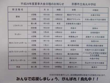 7月9日(日) サッカー部の試合から始まった夏季大会。3年生にとっては、いよいよ最後の大会となります。悔いの残らないように、全力を出し切って下さい。烏丸中学校全教職員が応援しています。(応援に行かれる方は、公共交通機関をご利用下さい。よろしくお願いします。)