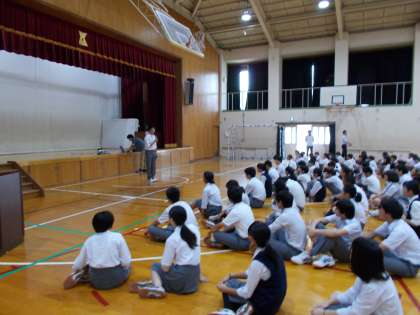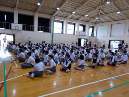8月25日(金) 第2期最初の全校集会が行われました。校歌斉唱から始まり、生徒会からの取組み紹介、伝達表彰、校長先生からのお話に続き、生活面の話といった内容で最後に新しく来られたALTの先生の紹介がありました。暑いせいか、少し元気がなかったようです。来週からは教科の授業が始まります。暑くても、しっかり集中し一日一日を大切に過ごしましょう。