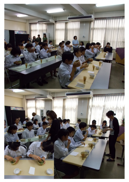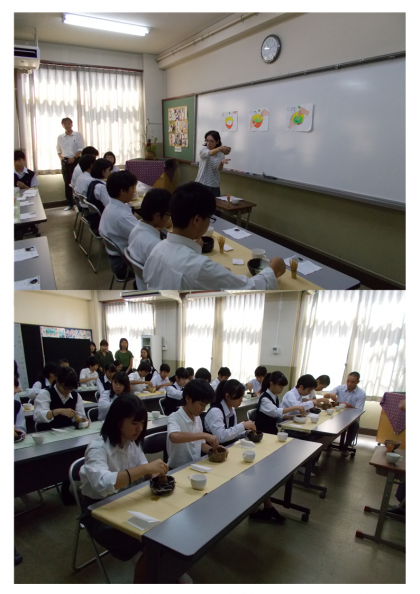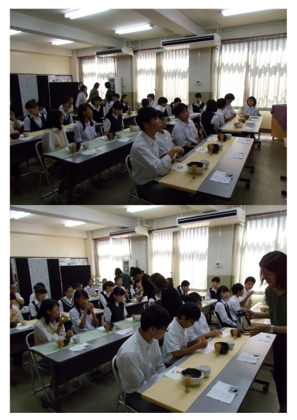 学校に戻り、PTA主催の「ミニ茶道体験」です。1年生は初めてとあって、少し緊張していました。うまくお茶を点てることができたのでしょうか。