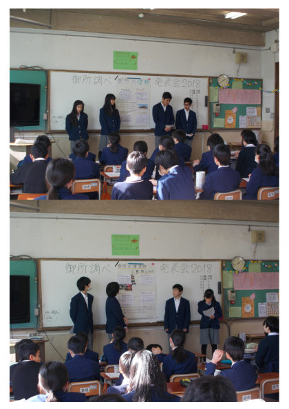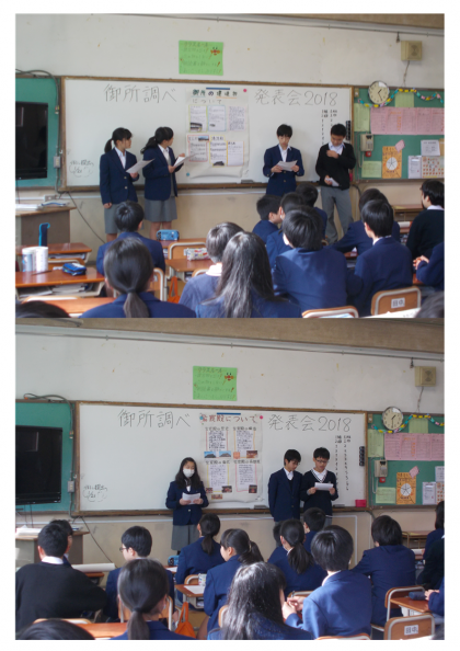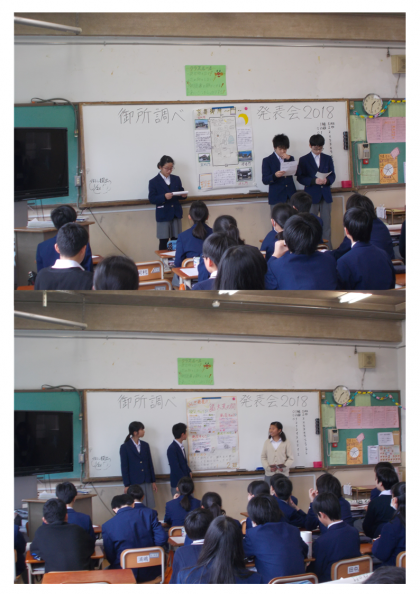 1年生 発表会 公開日 2018/01/25 更新日 2018/01/25 学校の様子 1月25日(木)5限 1年生が「御所調べ」の発表会を行いました。この冬一番の寒波が到来した日となり、1年生では朝から体調を崩し、早退する生徒が続出しました。そんな中、1年生は教室でそれぞれの班で調べたことを模造紙にまとめ、発表をしました。宮内庁からも参観に来られ、生徒の発表の様子をご覧になられました。