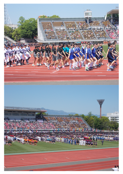 春体開会式 公開日 2018/05/01 更新日 2018/05/01 学校の様子 4月29日(日)西京極運動公園陸上競技場にて第60回春体開会式が行われました。雲一つない快晴のもと、烏丸中学校の代表生徒74名は元気いっぱい行進してくれました。