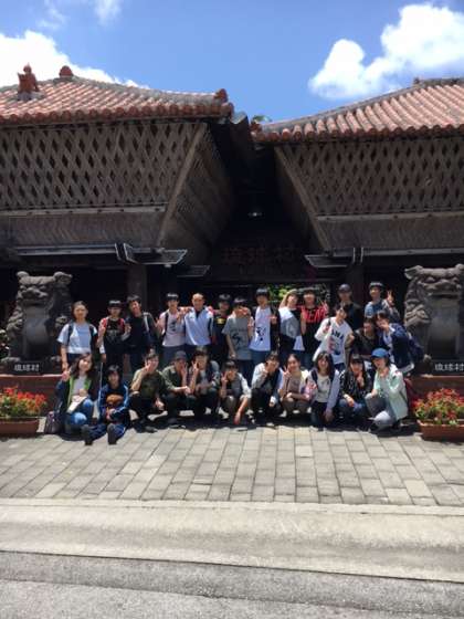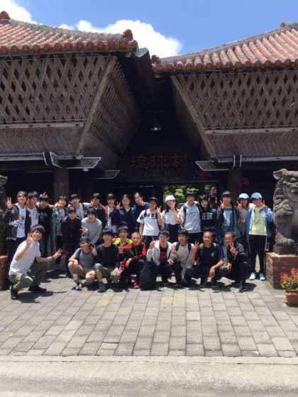 琉球村ゲート付近でクラス別の写真撮影です。今日の天気は快晴です。次の目的地はニライカナイでの体験学習です。