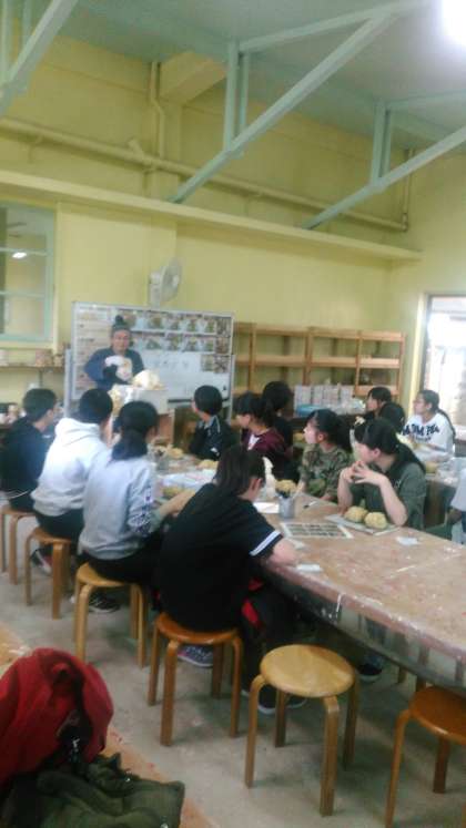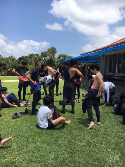 修学旅行 20 公開日 2018/05/11 更新日 2018/05/11 3年修学旅行 ニライカナイでの体験学習です。シュノーケリング体験の人たちはウエットスーツに着替えています。文化体験の人たちはシーサーづくりです。