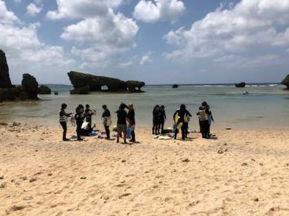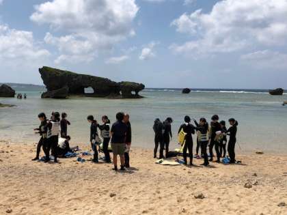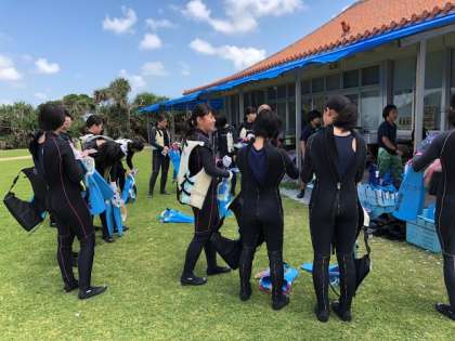 コバルトブルーの沖縄の海をシュノーケリングです。ウエットスーツに着替えて、いざ海へ。