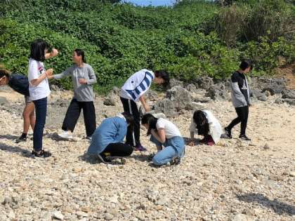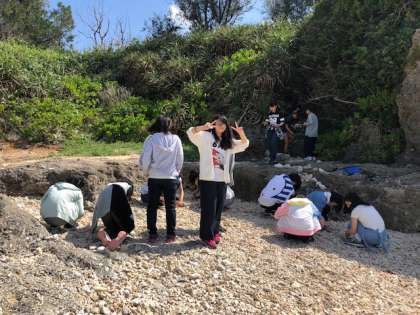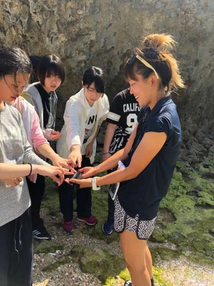 海岸を探索しています。何がいるのかな? なまこを見つけてみんなで触っています。