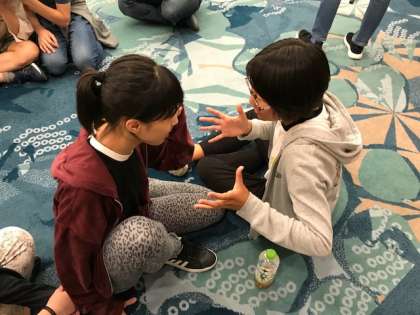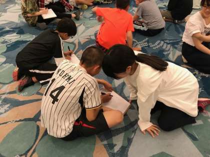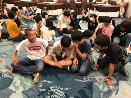 夕食後、会場ファミーユにて学年レクレーションです。伝言ゲームの様子です。