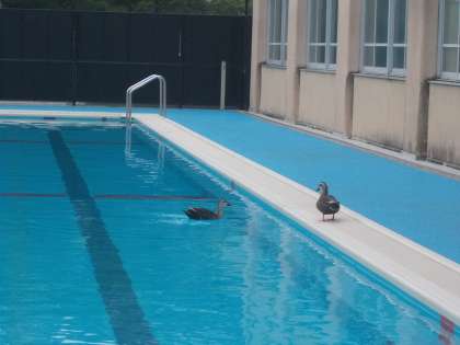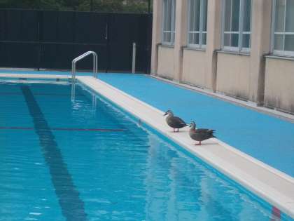 5月28日(月) プール掃除も終了し、綺麗になったプールには生徒よりも先に、カモが水泳を楽しんでいます。