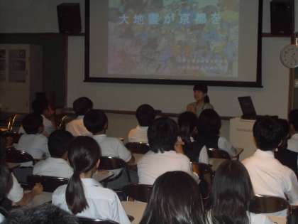 7月4日(水)5,6限 1年生は総合の時間に、今年のテーマである「地域の伝統文化と防災」について取り組みました。本日は上京区役所から3名の方に来校して頂き、防災についての講演をして頂きました。みんな真剣に取り組んでいました。