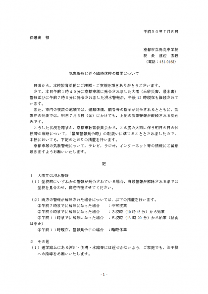 7月6日の警報に伴う休校措置について
