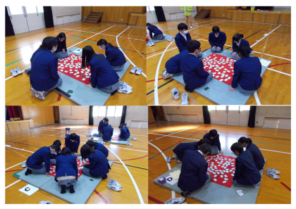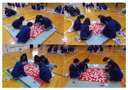 1年 百人一首大会 公開日 2019/01/30 更新日 2019/01/30 学校の様子 1月30日(水)6限 1年生の百人一首大会が体育館で行われました。2年生と合同で行われました。白熱した試合展開に体育館は熱気に包まれていました。読み手の先生方も気合いが入ります。