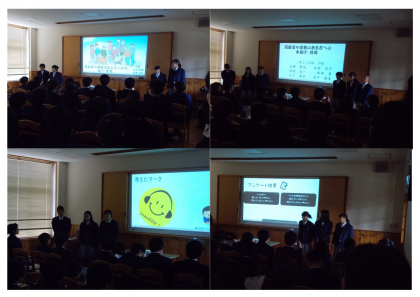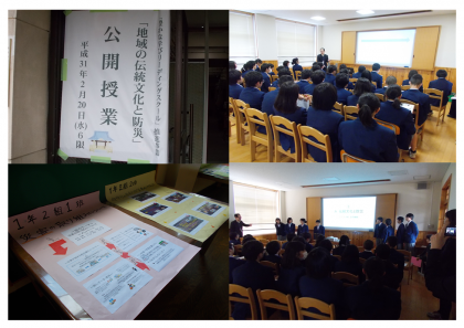 2月20日(水)1年生は、いきいき交流ルームにて公開授業を行いました。総合的な学習の時間に取り組んでいる、「地域の伝統文化と防災」についての発表会です。本校は今年度、京都市教育委員会の指定を受けて、「豊かな学びリーディングスクール」の事業に取り組んでいます。その一環として行いました。1年生は、たくさんの来校者の前で、少し緊張しながらも、立派に発表をしていました。どの班もよく頑張りました。ご来校いただいた皆様、お忙しい中ありがとうございました。