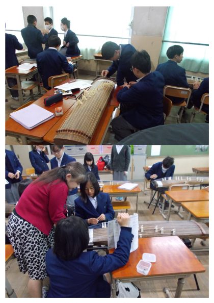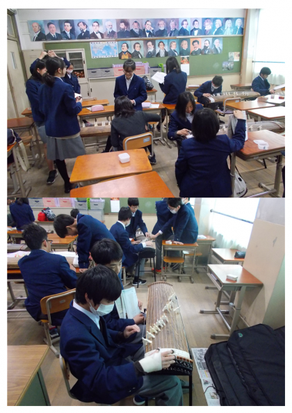 1年 音楽 公開日 2019/03/13 更新日 2019/03/13 学校の様子 3月13日(水)1年生は、音楽の時間に琴の演奏授業を行いました。なかなか上手く音が出せなくて、苦労していました。最後は全員で、音楽に合わせて琴の演奏に挑戦しました。