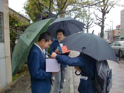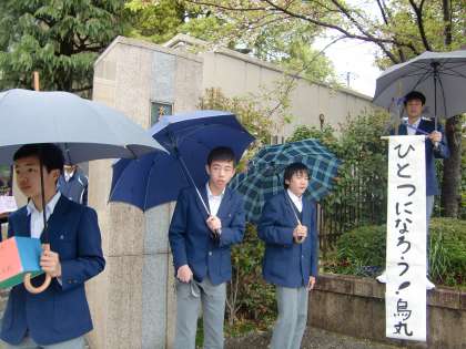 生徒会執行部の生徒が烏丸中学校校門前にて、東日本大震災の義援活動を行いました。