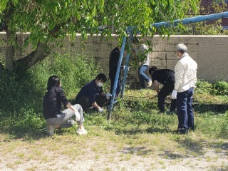 グランドの草むしり 公開日 2020/05/07 更新日 2020/05/07 学校の様子 3.4組の先生も グランドの草むしりに 駆けつけてくれました! 桜の木は毛虫にも 気をつけて作業を進めています。