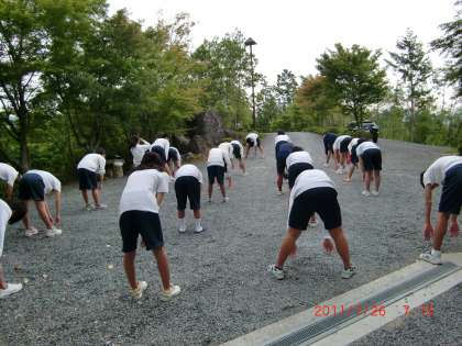 7時からラジオ体操、校歌練習をしました。