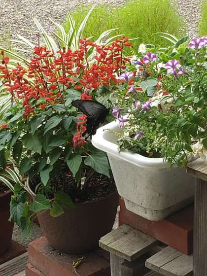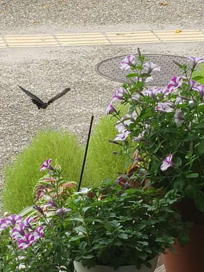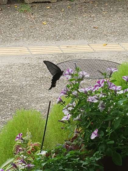 玄関の花に クロアゲハが来ました。 花と緑のあふれる学校 烏丸中学校ならではの 素敵な光景ですね。