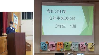 3月11日(金) 公開日 2022/03/11 更新日 2022/03/11 学校の様子 3年生送る会の様子 1.2年生が3年生のために 体育館の飾りつけをしてくれました。 温かい雰囲気の会場にしてくれました。 ありがとうございました。
